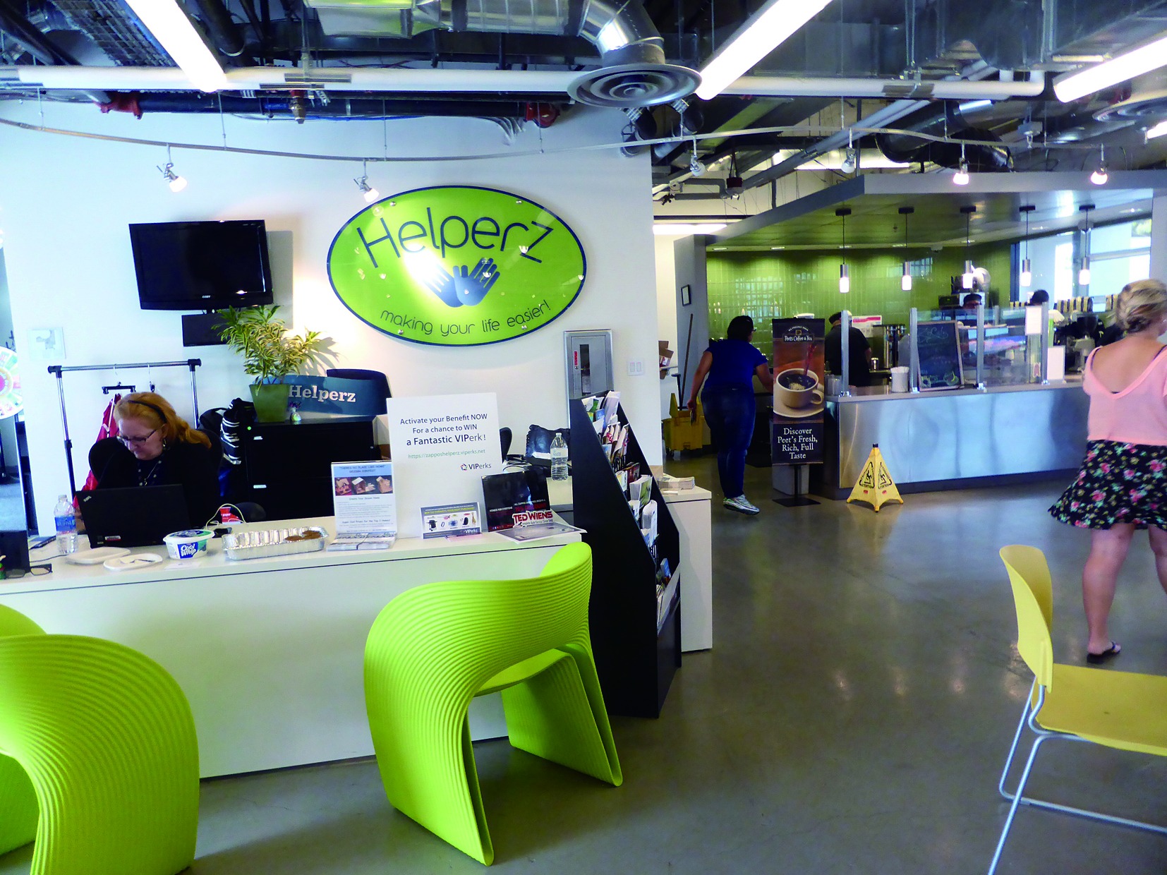 ![]() 勤務中の車の修理の手配など、各種サービスを受け付けるコンシェルジュのいる社内カフェ。ヘルシーな食べ物が無料もしくは廉価で提供される