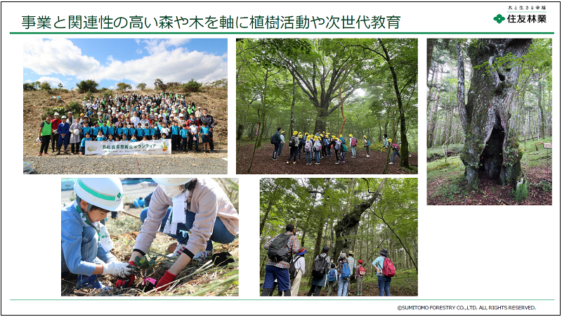 また、森林経営から派生し、植樹活動や次世代教育にも注力。東日本大震災で被害を受けた宮城県東松島市での防潮堤の植樹活動などを行いながら、長い年月を必要とする森林の再生に向け、地域の環境保全を受け継ぐ次世代の子どもたちの教育に関係各所とともに取り組んでいるという。
