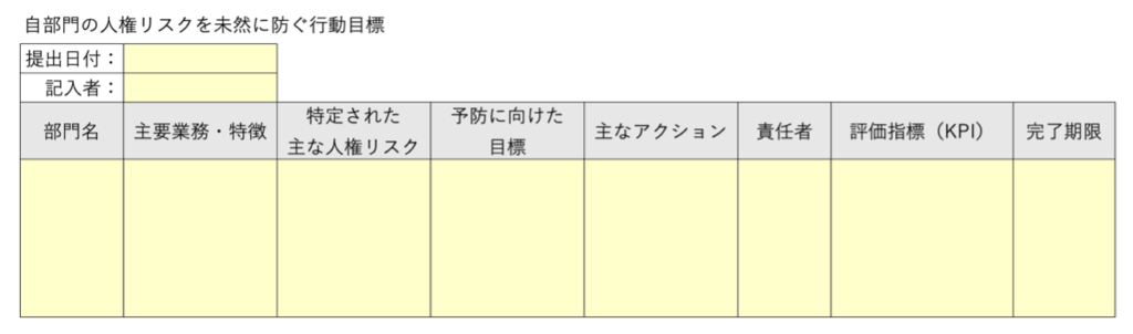 各部門長が調査結果を発表し、全員で活発に議論。次の宿題は「自部門の人権リスクを未然に防ぐ行動目標」を作成すること。事務局が用意したフォーマットを使って具体化を進めます。