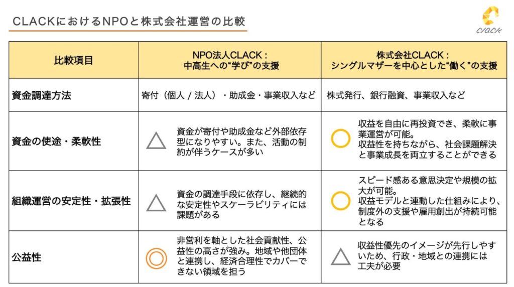そこで、中高生への教育の部分はこれまで通りNPOが担い、シングルマザーへの教育と人材紹介という形で実際の仕事につなげる部分は株式会社が担う、という明確な役割分担をすることにしました。就労支援はシングルマザー向けに開始しますが、ゆくゆくは、株式会社側で関係構築した就労先を、NPOで育った子どもたちの未来の選択肢として提供できるような相乗効果も生み出していきたいと考えています。