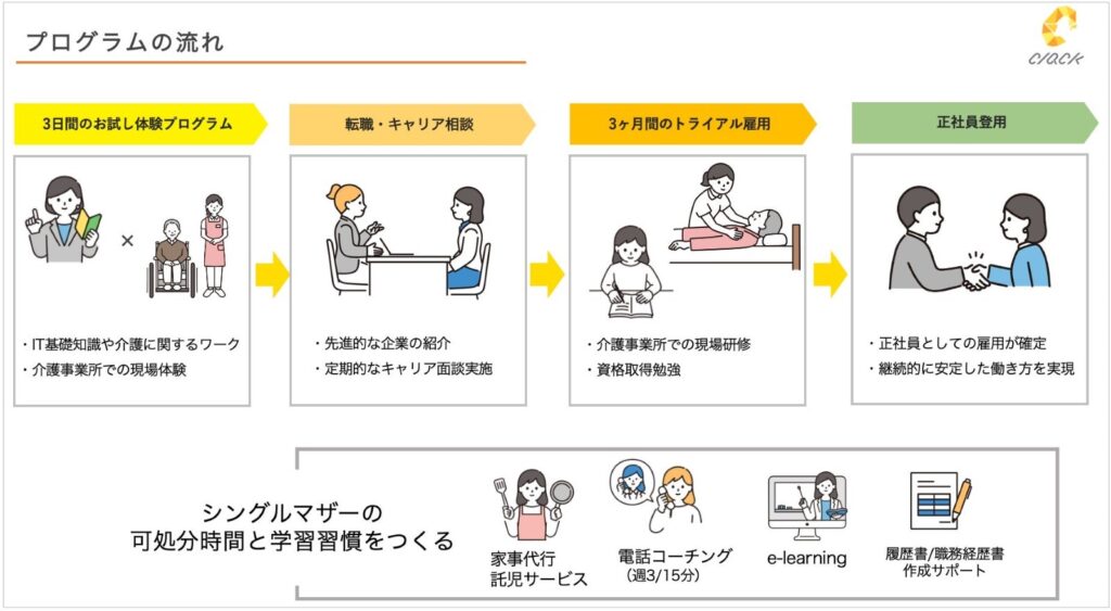 当面は、福祉領域に絞って就労支援を行う予定です。福祉というと待遇が悪いというイメージが根強いかもしれませんが、人手不足だからこそDXを進めて働き方・待遇の改善を進めている事業所もあります。しかしシングルマザーは時間が無いし情報にも触れられていない。この橋渡しをすることで、「長く働き続けられる」という双方にとって最大のメリットを生めるはずです。
