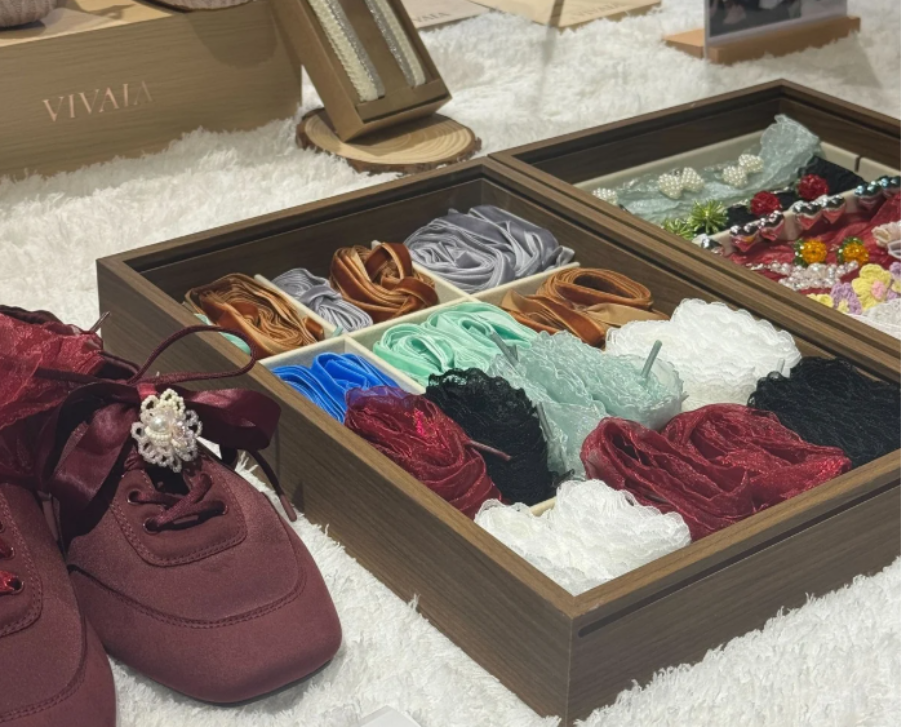 発表会終了後には、参加者がVIVAIAの靴を自由にカスタマイズする「シューレースカスタマイズ体験」が開催された。色とりどりのリボンが用意され、各自が好きな靴とレースを組み合わせてアレンジを施した。カスタマイズに使用されたVIVAIAのスニーカー「Yancy」にもリサイクルナイロンが使用されているほか、自宅での洗濯も可能。マリナ氏によると、これらの特徴も、「シューレースアレンジや自宅でのケアを通して、楽しみながらサステナビリティを実現してほしい」という願いが込められた取り組みだという。