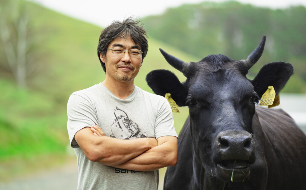 なかほら牧場は40年前、初代の中洞正氏が山を開墾して始めた。家畜にストレスを与えない通年型の昼夜放牧と植物飼料による飼育を徹底し、2017年には日本で初めてアニマルウェルフェア(家畜福祉)認証を受けた。