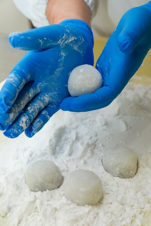 おかゆ大福の生地には、もち米ではなくうるち米を使用する。これにより伸びを抑え、さらに加熱せず練ることで口の中ですっと溶けるなめらかな食感を実現した。