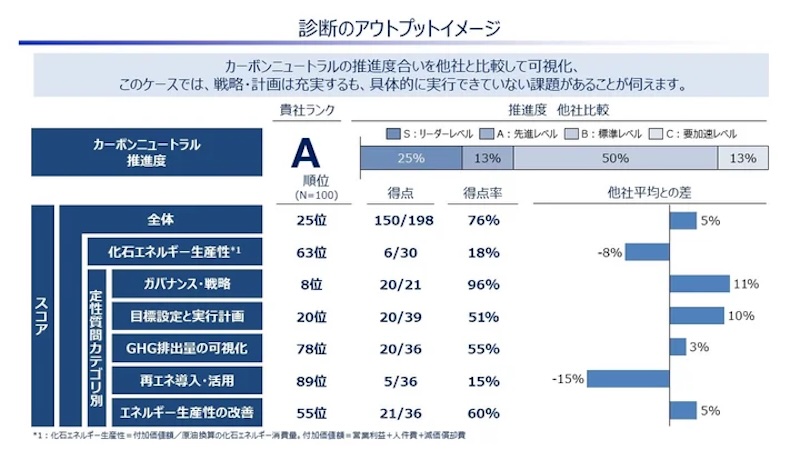 診断はこのフィードバック資料を通して各社の具体的課題を浮き彫りにするところまでを指す。環境関連情報の開示促進を目的にCDPなどが行うスコアリング評価とは位置付けが異なり、あくまで「課題を顕在化し、企業自身が次の一手を検討するための判断ツール」(西花氏)となるものだ。