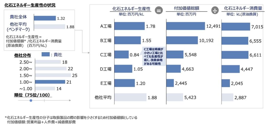 工場ごとの化石エネルギー生産性の違いは、上図の具体例が分かりやすい。この企業では、5工場のうちC工場の化石エネルギー生産性が0.84と最も低かった。一方で、付加価値総額はD工場やE工場の方が小さく、それらと比べてC工場には改善余地がある可能性が高い。