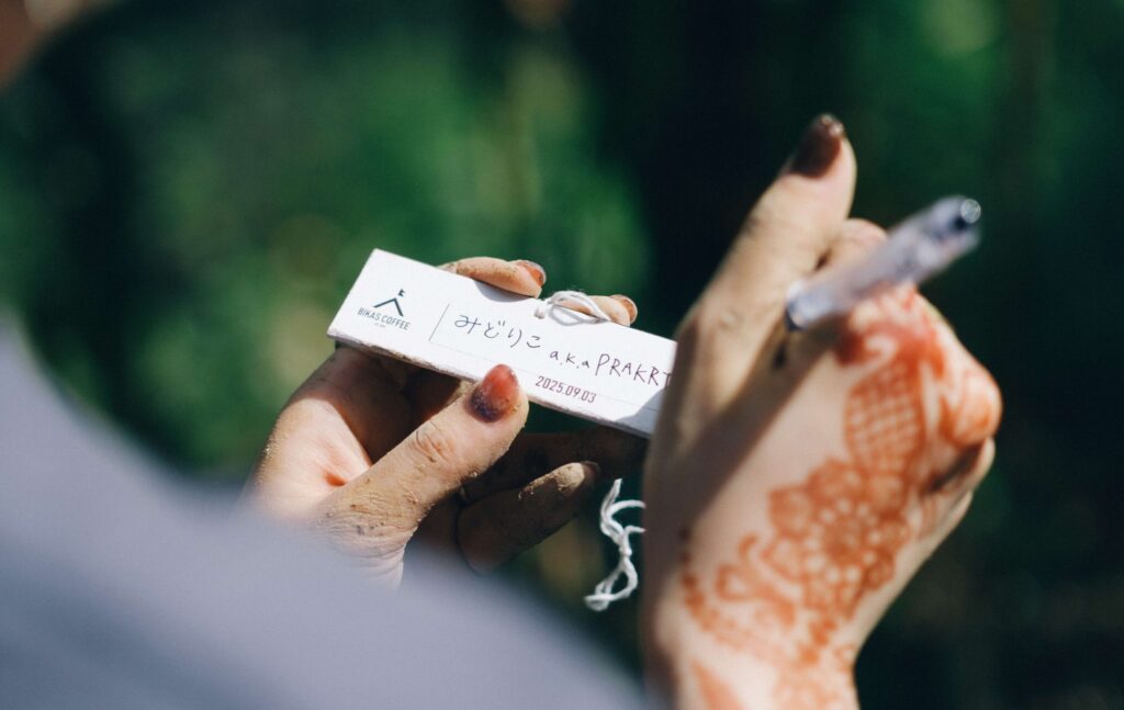 コーヒーの木には、「みどりこ prakriti」と書いたプレートをつけました。自然の一部であるような自分の本名もとても気に入っていますし、名付けてもらった「自然ーprakritiー」も自分の人生の大切にしているものに通じるようで、大切な名前になったからです。