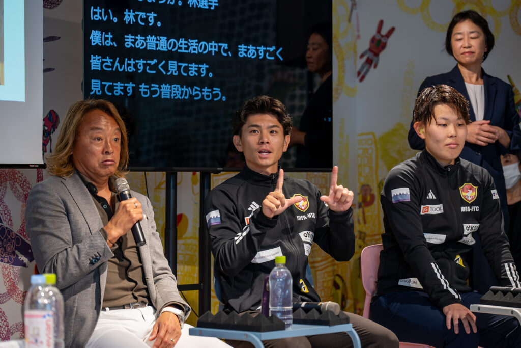 最初のトークセッションには、元サッカー日本代表で、日本障がい者サッカー連盟会長の北澤豪さん、デフサッカー日本代表の林洸大選手、國島佳純選手が登壇した。デフサッカーのルールは通常のサッカーと同じだが、試合中は補聴器を外すため音は聞こえない。選手たちは視覚情報を頼りにプレーする。