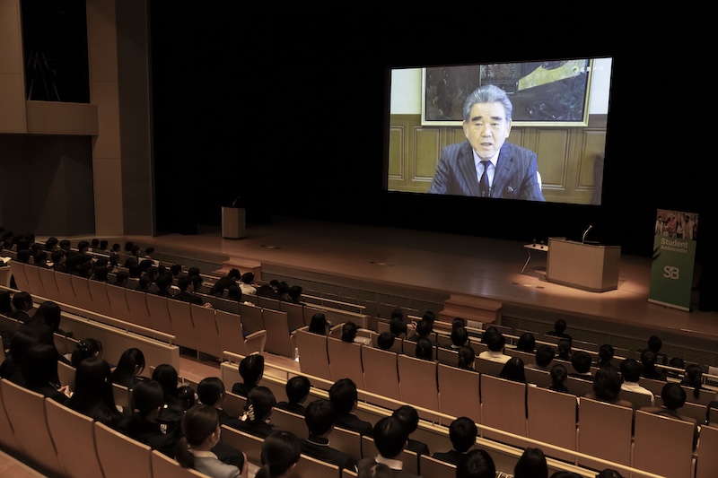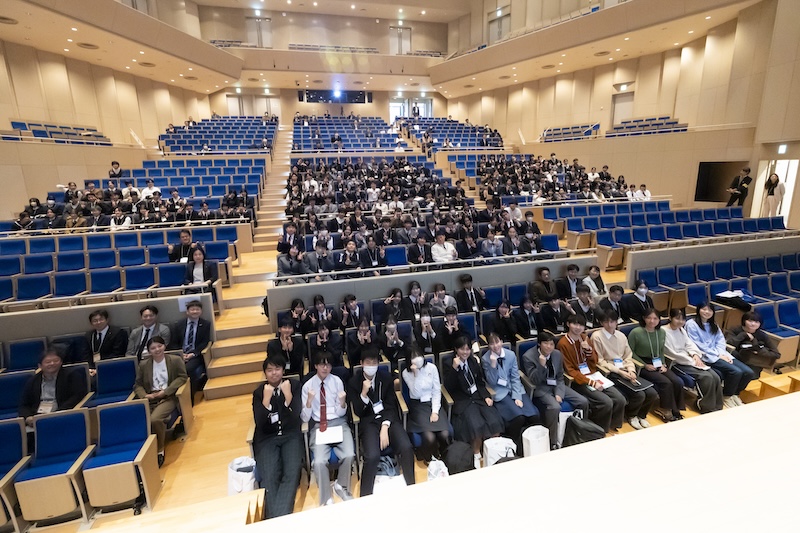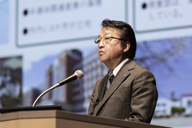 冒頭、広島大学の越智光夫学長がビデオメッセージを寄せた。被爆80年の節目に触れ、創立76周年を迎える同大学が、「平和を希求しチャレンジする国際的教養人の育成」をスローガンに掲げるとともに、2030年度のカーボンニュートラル達成とスマートキャンパスの実現を目指して野心的な取り組みを進め、国際的にも高く評価されていることを紹介した。