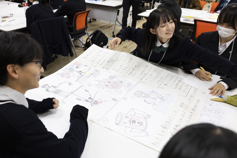 講演後のワークショップのテーマは、「SDGsの17目標の中から訴求したいものを選び、そのCMの絵コンテを作る」というもの。高校生たちは、示された約15秒の枠内で何をどう“視聴者”に伝えるか、映像制作の設計図となるストーリー作りとイラスト作成に挑戦し、ジェンダー平等や、子どもの貧困や教育格差、そして広島から平和の大切さを訴える作品が次々に出来上がった。