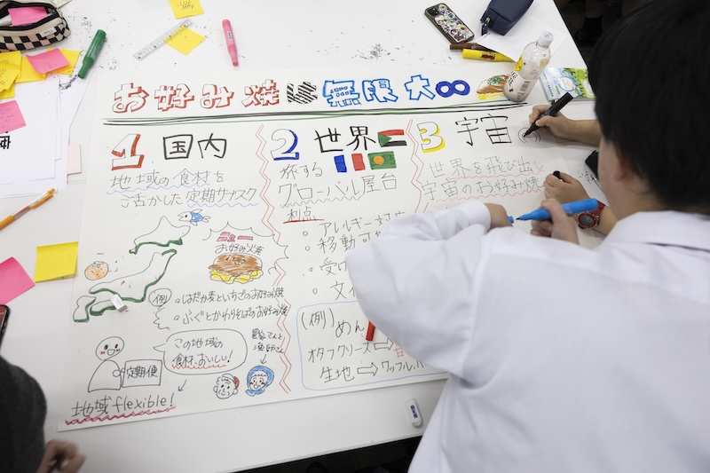 ディスカッションのお題目は、ずばり「SDGsなお好み焼きを考えよう!」。高校生は、春名氏のプレゼンをもとに柔軟にお好み焼きのイメージを広げ、全国各地の特産物を食材に使ったお好み焼きのセットが届くサブスクや、アフリカやアジアでキッチンカーを走らせながらその国に合ったスパイシーなソースも使ってお好み焼きのおいしさをアピールする作戦、さらには「宇宙に移住する未来」に向けて、宇宙で足りない栄養素を補うお好み焼きなど、夢のあるアイデアがたくさん生まれていた。
