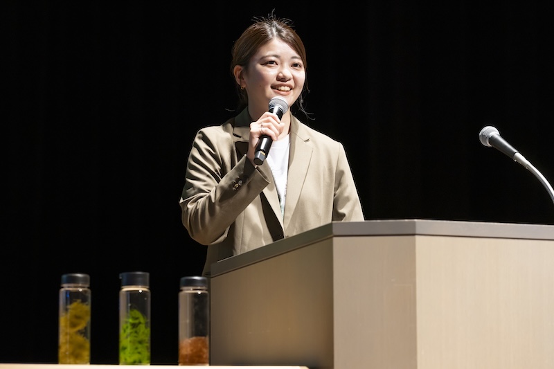 基調講演には四国大会に続いて、合同会社シーベジタブルの研究開発メンバーで、東京大学大学院生の新北成実(しんぼく・なるみ)氏が登壇。日本の海藻を取り巻く課題を提起しながら、大学時代の授業をきっかけに、どんどんのめり込んでいったという海藻への思い入れを語り、高校生に「大事なのは感じる力。日々、自分自身と向き合うことで、これだと思えるものと出会える。自分の感性を信じ、好きなこととサステナブルアクションがカチッとはまる瞬間を見逃さないで」と呼びかけた。