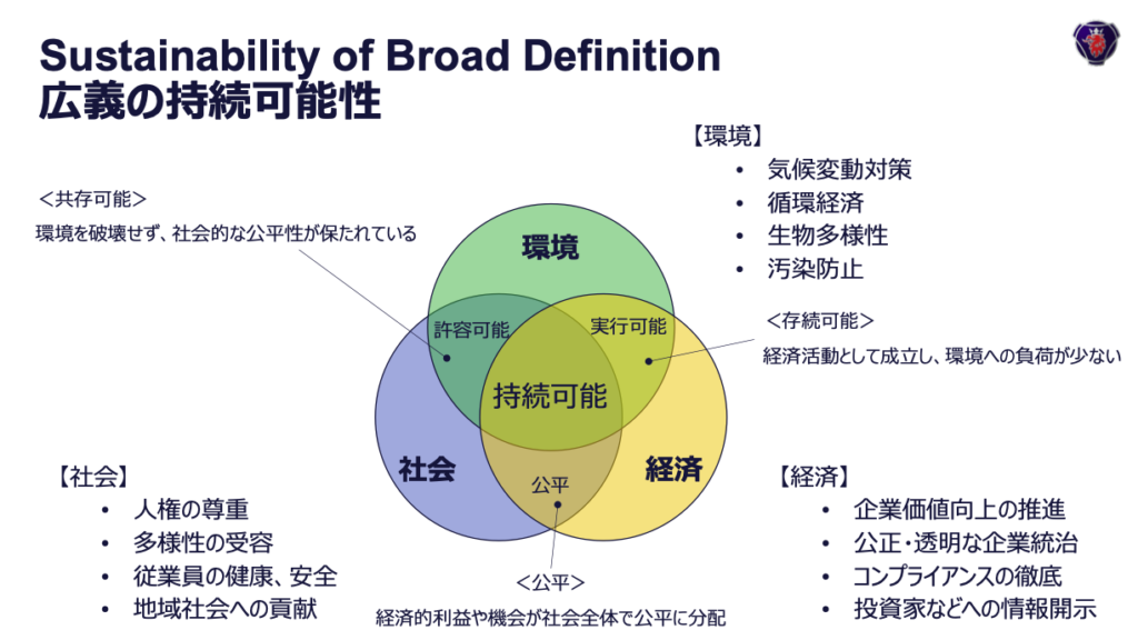 木内氏(プリセールス&ロジスティクス 持続可能輸送戦略 シニア・エンジニア)は、持続可能性を「環境・社会・経済」の3つが同時に成立する状態として捉える。環境目標だけを追い、輸送品質や事業の成立性が損なわれれば、脱炭素社会への移行は続かない。物流は社会インフラであり、現実の運行を回しながら排出を下げる道筋が必要だ。環境・社会・経済の3つの要素が融合して初めて、持続可能な輸送システムが実現するという。