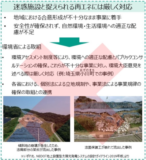 特に環境省は何年も前から、環境破壊につながるような再生可能エネルギー発電所の是正を各種の資料などで発信してきた。特設のWebサイトでは、「環境省は、地域における合意形成が図られ、環境に適正に配慮し、地域に貢献する、地域共生型の再エネ導入を支援していきます。」と明言している。