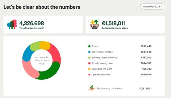 その使い道については、毎月ウェブサイトで利用者に向けて公開されている。例えば2025年11月のレポートを見ると、気候変動対策に約151万8000ユーロが使われ、そのうち植林には約99万3000ユーロ(430万本の植林)、再エネや再生型農業などに約52万4000ユーロが充てられていることが分かる。もちろん、運営のためのコストも可視化されている。