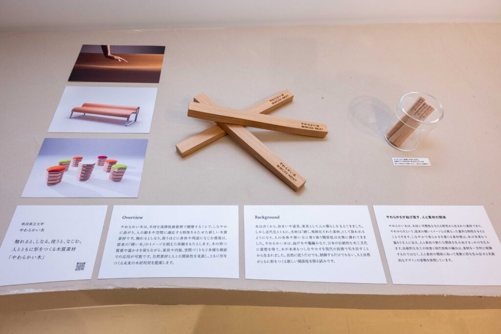 秋田県立大学が出展した「やわらかい木」は、しなやかに曲がり、人の動きや空間に適応する特性を持たせた新しい木質素材。チヨダ工業は「木の組織を滑らせて金型で成形する」という全く新しい成形技術を紹介した。