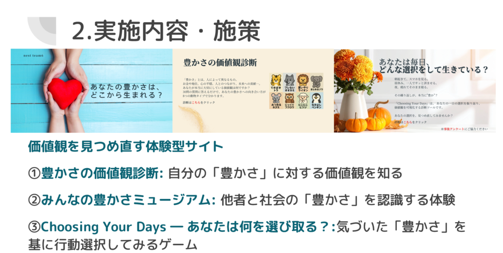 「自分自身はやりたいことを選べる環境にいたが、家庭によって状況は違う。そこで、進路選択時にあまり目を向けられていない『親』にフォーカスした」と語る大垣さん。nestでの経験を経て「人々を巻き込むリーダー的参謀として、今後もプロジェクトの構造やプロセスを考えることに力を入れたい」と、自らの強みを力強く宣言した。