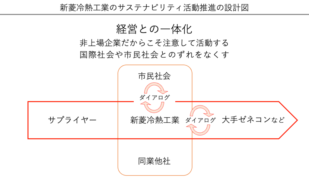 非上場であるため、投資家からのESG評価や市場の圧力はありません。BtoB企業であることも重なり、生活者からの声も限定的です。この構造は、サステナビリティ経営において「ずれ」が生じやすい環境でもあります。だからこそ、新菱冷熱は自らを律し、問い続けています。10年のお付き合いになりますが、その姿勢は一貫しています。