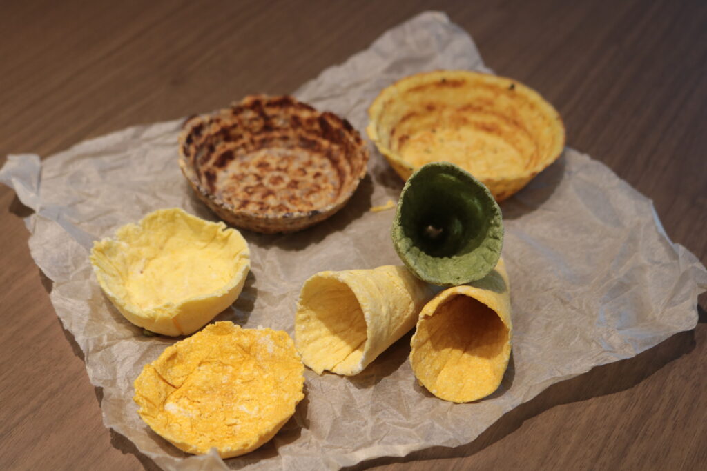 最初はおからと脱脂粉乳だけで作ろうとしましたが、味が淡白すぎたため、規格外野菜を入れることにしました。あとは、お皿が分厚すぎて、お皿だけでおなかいっぱいになってしまうなどの苦労もありましたが(笑)、まずはできることからものを作ろうと、試行錯誤を重ねてきました。