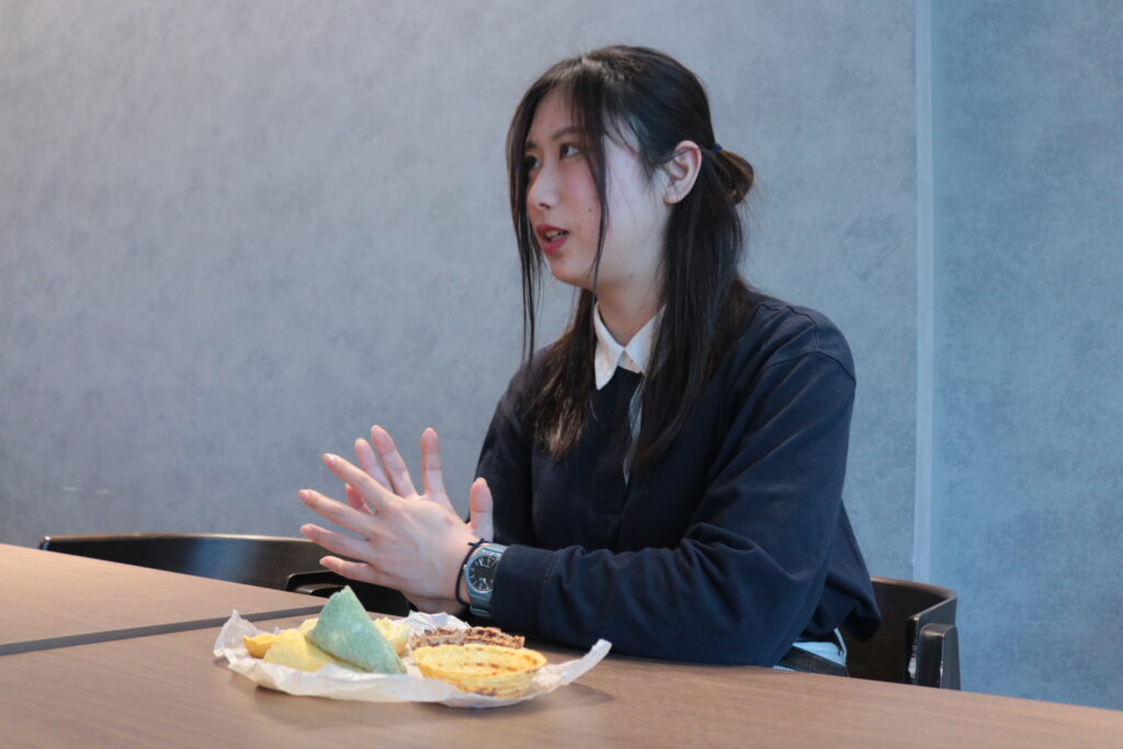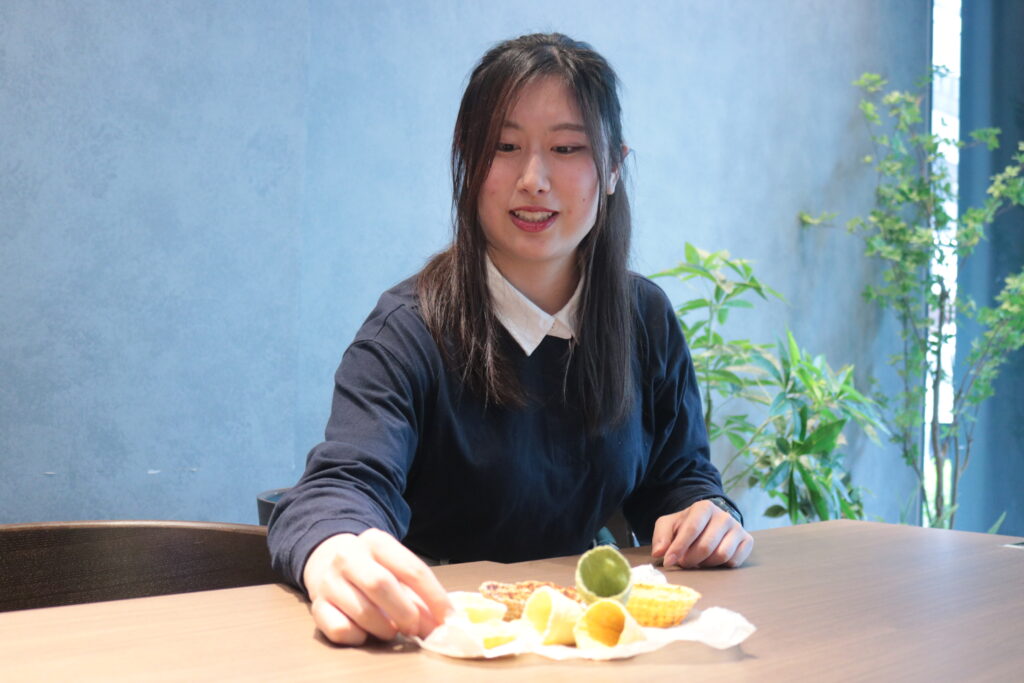 北海道大学で、環境問題と行動変容について、環境社会心理学の視点から研究しています。授業でアプローチを学びつつ、自分でも北海道の事業者を回って現場の声を聴いています。活動としては、未利用の野菜や脱脂粉乳、おからを使った「オカラダサラダ」という食べるお皿を開発しています。