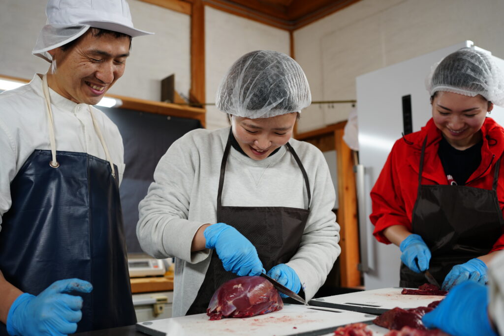 その後は処理場に移動し、私たちが実際に鹿を精肉していきます。解体された後ろ足の部位が目の前に置かれた瞬間、「食材としての鹿」と「生き物としての鹿」が同じ個体であることを実感し、言葉を失いました。