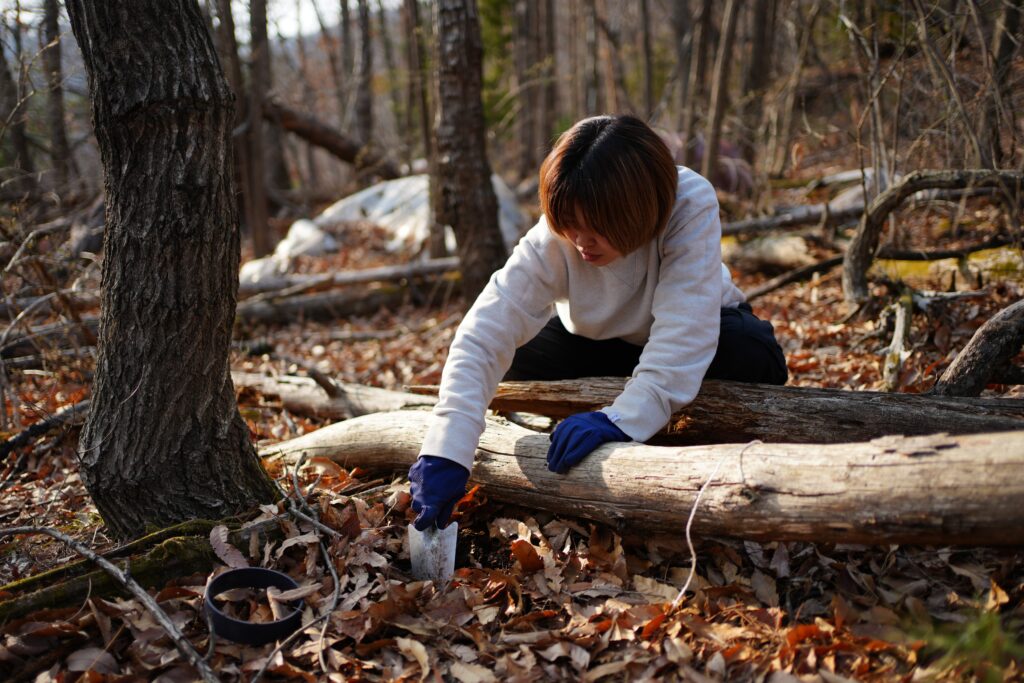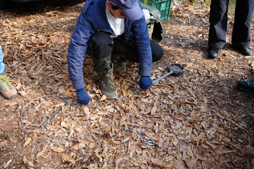 午後は山へ移り、罠をかける体験をしました。直径12センチほどの丸い罠で、足を踏み入れるとワイヤーが締まる仕組みです。小川さんは「鹿がここを通ったみたいだね」と言いながら、落ち葉のへこみ方やフン、足跡から個体のルートを予測していきます。私も手探りながら場所を考えて、設置しました。