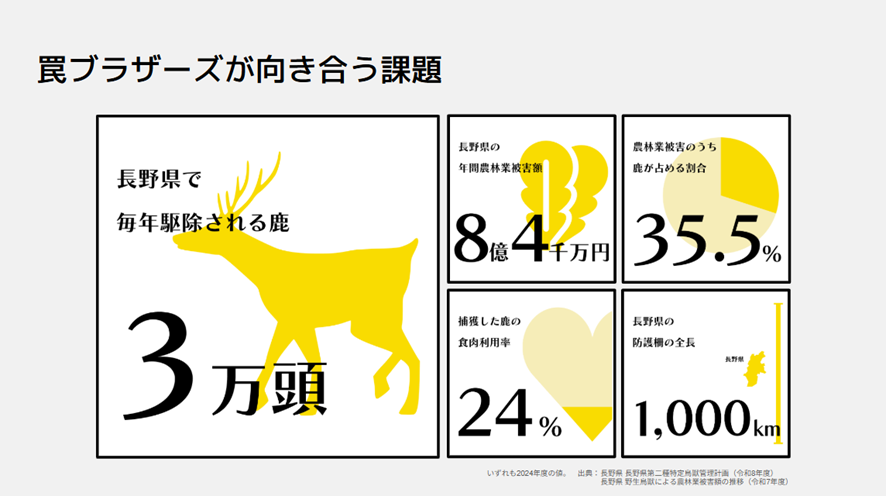 しかし、そのおいしさの背後には、山と狩猟に関する現実があります。長野県では近年、鹿が急増。2024年度、同県内の農林業被害8億4千万円のうち、ニホンジカによる被害が35.5%と最多となっています。手塩にかけた作物を奪われることは、農家にとって死活問題です。