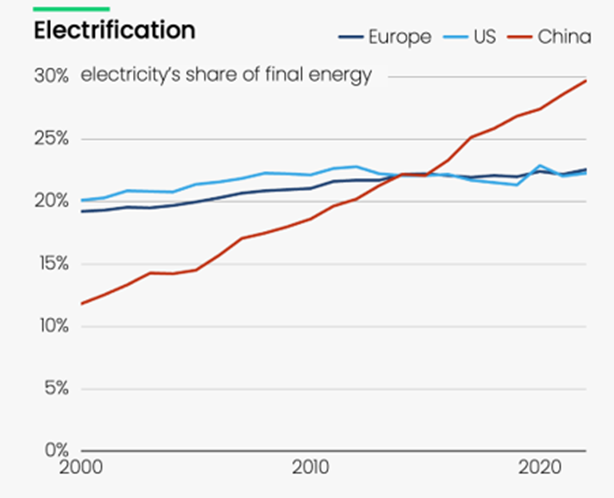 欧州と米国が20%前半でほぼ固定しているのに対し、中国は2000年の10%強から30%直前まで急激に伸ばしている。欧州と米国は現状の電力を再生エネに替えてきてはいるが、交通や熱分野での電化が進んでいない一方、中国はBEVの導入で抜きん出ているように、電化そのものに手が入っているのである。