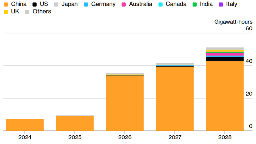 上のグラフは、2025年までの導入実績と2028年までの予測を示している。2025年は世界で過去最高の9.6GWhを記録し、そのプロジェクトのほぼすべてが中国であった。もちろん導入されている技術の多くも中国のものである。グラフは世界での導入を表すためのものであるが、ほぼ中国を示すオレンジ色で埋め尽くされている。