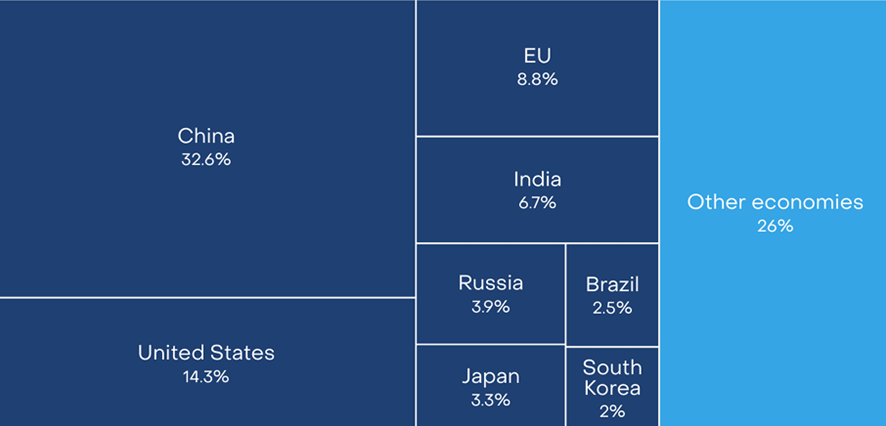 電気大国の定義としてまず思いつくのは、電気使用量の大きさである。下の図は、イギリスの著名なエネルギー関連のシンクタンク、Emberによるもので、電力需要の大きい国々の世界でのシェアを表している。