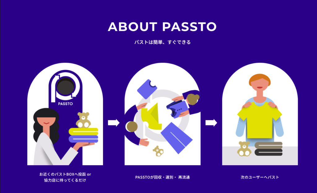 PASSTOは「PASS TO(次の人に渡す)」を縮めた造語です。商業施設やマンション共用部への回収ボックス設置から、LINEヤフーと連携したスマートフォン一つで自宅まで集荷に来てくれる仕組みや、自治体と組んだリユース品回収の日まで、複数の形で展開しています。現在は全国約6000拠点まで広がりました。