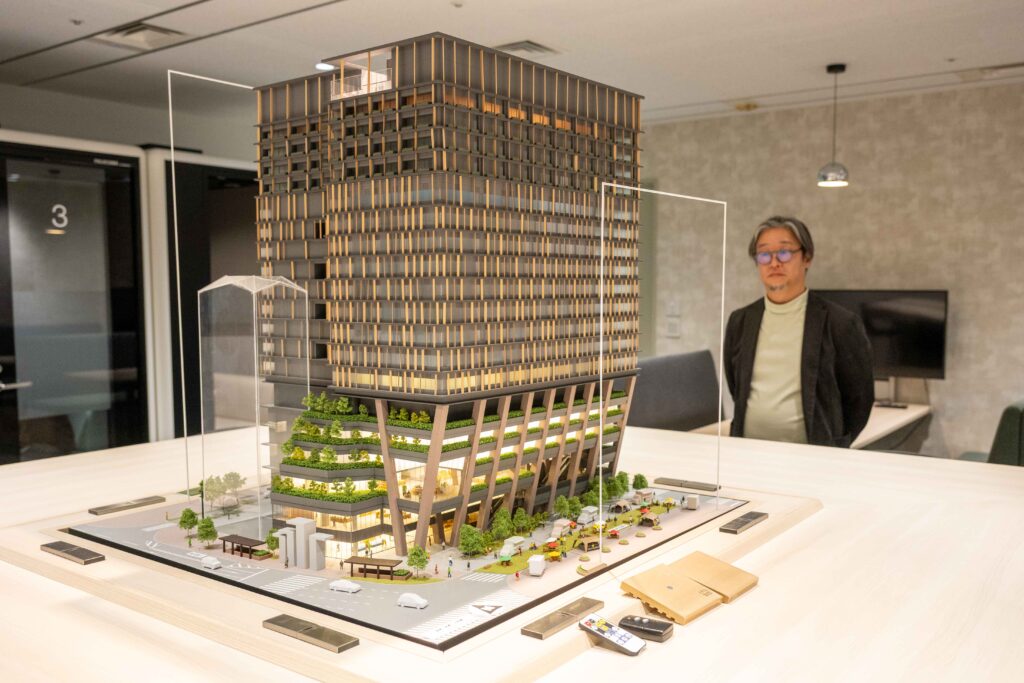 林:1-7計画では、九州産CLTパネルを建物外装に約450立方メートル使用しています。日射熱を約40%削減する省エネ効果とともに、固定されるCO2は約259トンに上ります。全館の使用電力を再生可能エネルギー由来とすること、40本以上の高木や900平方メートル超の緑地を設けることも合わせて、省エネ性能や環境・健康配慮を多角的に評価する「LEED GOLD(BD+C: Core and Shell)」「ZEB Oriented」「CASBEE福岡」「CASBEE ウェルネスオフィス Aランク」といった各種環境認証の取得を予定しており、一部はすでに取得済みです。