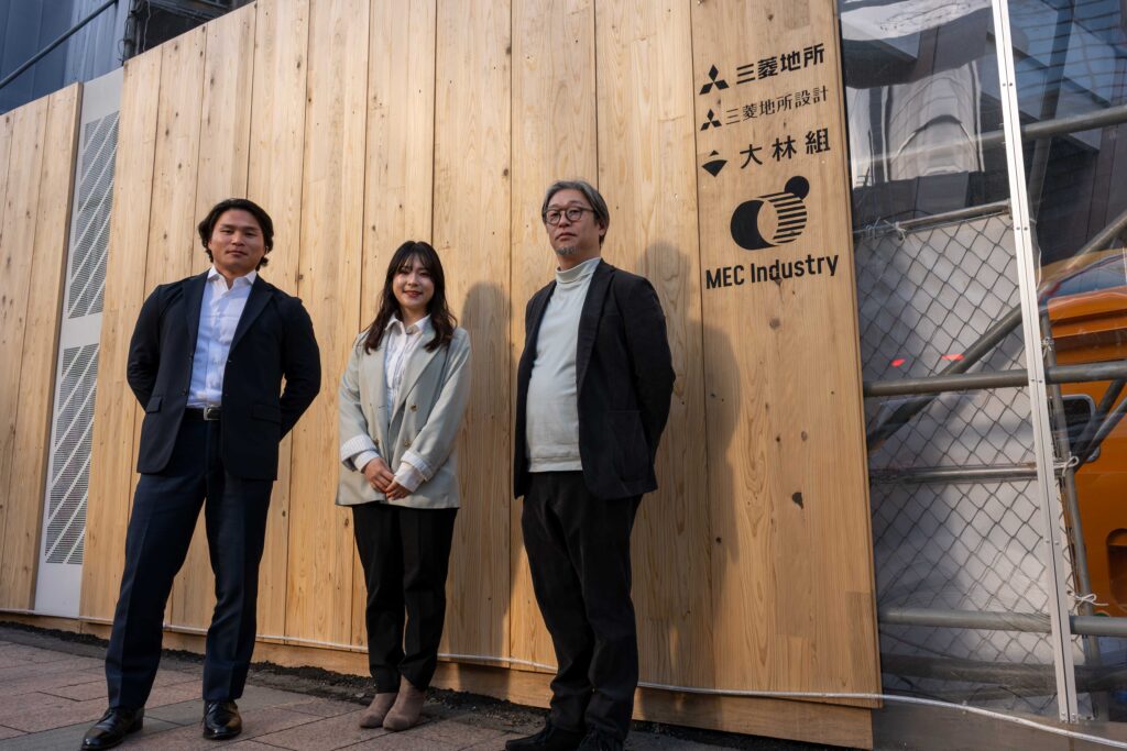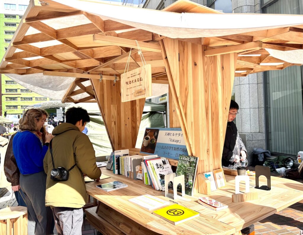 林:工事現場の仮囲いも、全周を建物外装と同じくMEC Industryが製造する九州産の無塗装杉材で行っています。街の人たちが写真を撮ったり、手で触れたりしてくださる姿をよく見かけます。また、工事終了後の仮囲い撤去材を廃棄するのではなく、什器(じゅうき)などとして新たに再活用する検討を、九州大学の学生と協力して行っています。1-7計画開業後の恒常的な設置を目指して、イベントや公開空地での試験的な設置も行っており、建材のアップサイクルという観点でも新たな試みです。